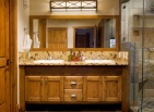 The master bedroom is located directly off the kitchen. It’s very spacious and measures approximately 20’ x 20’. It was furnished with a king sized Mission Craft style bed made of cherry and was luxuriously comfortable due to the feather bed mattress and down comforter. The room also had two matching nightstands, an oversized dresser, a leather armchair and another LG flat-screen TV.